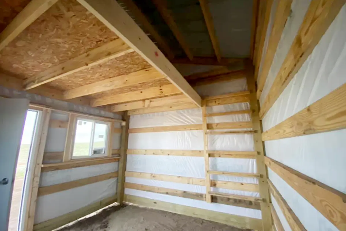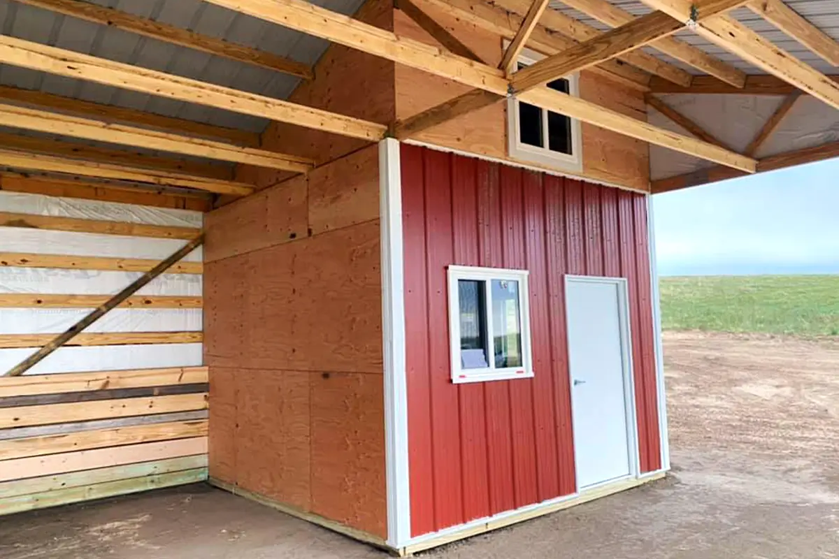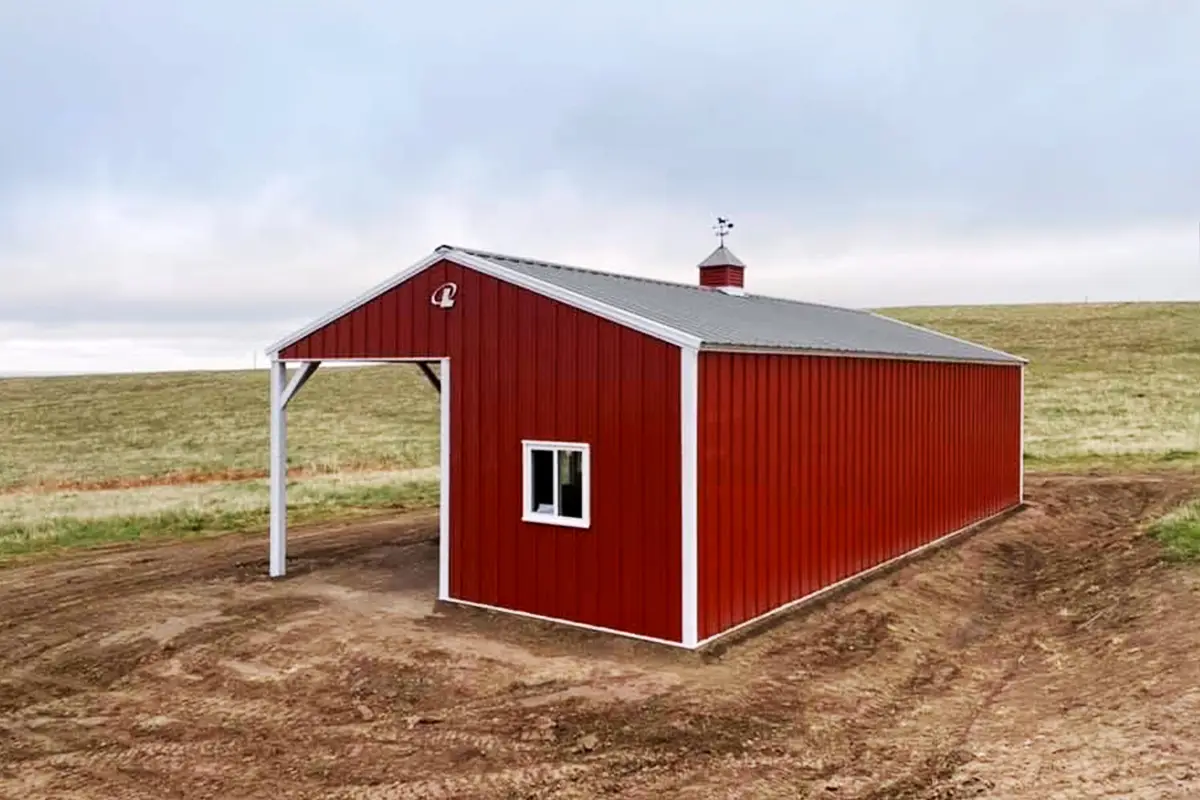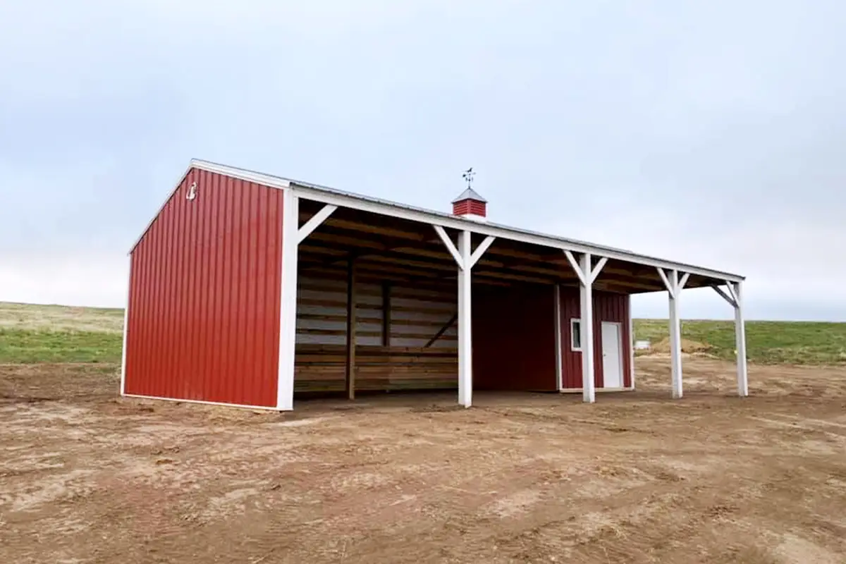 The structure is a 24′ x 48′ equine shelter that includes a tack room and is topped with a decorative cupola. It showcases a distinctive color scheme using Lester colors: Barn Red, Quaker Grey, and Snow White.